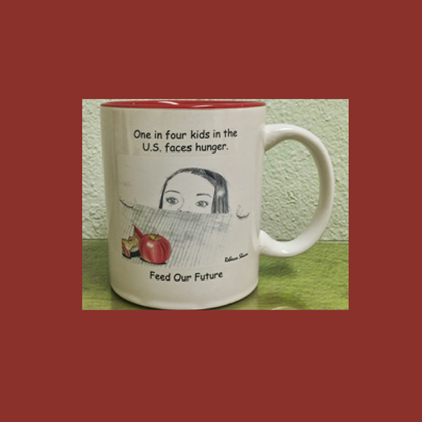 Artist - Rebecca Shaver Medium - Ceramic Mug Size – n/a Price - $15.00 Shipping - $5.00 Style # - NorthStar02 % to Charity - 100% Details: "Feed Our Future" artwork mug with red interior. 15.00 USD