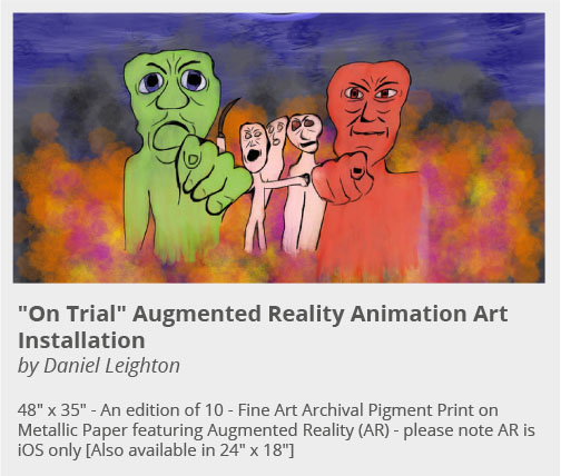 With certain paintings, Daniel adds Augmented Reality (AR).  AR is a technology that combines Daniel’s backgrounds in filmmaking and computer programming with his paintings. Using the Daniel Leighton Art + AR app (which Daniel created in late 2013/early 2014), viewers can experience additional dimensions of Daniel’s AR -enhanced paintings.  As Shana Nys Dambrot writes, Daniel’s app, “turns your device into a viewing portal into what it is tempting to describe as a parallel universe.”