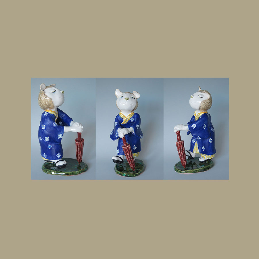 Artist - Josephine Lai Medium - Clay/Pottery Size – 8.5 inches height Price - $195.00 Shipping - $20 USPS ground retail (domestic US) Style # - % to Charity - 30% Details: Hand built and painted porcelain figurine. This rain dancing cat is one of the Shape-Shifters in my Fantasy Creature Series. The Rain Dancer is Protector of woodland flora. His pose recalls Gene Kelly's Singin' in the Rain 195.00 USD